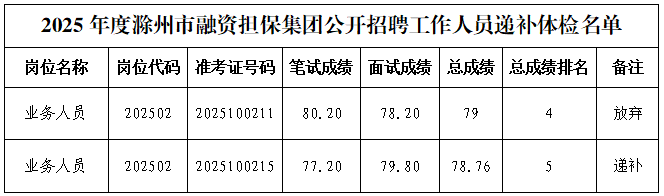 關(guān)于滁州市融資擔(dān)保集團(tuán)有限公司2025年公開招聘工作人員遞補(bǔ)體檢的公告